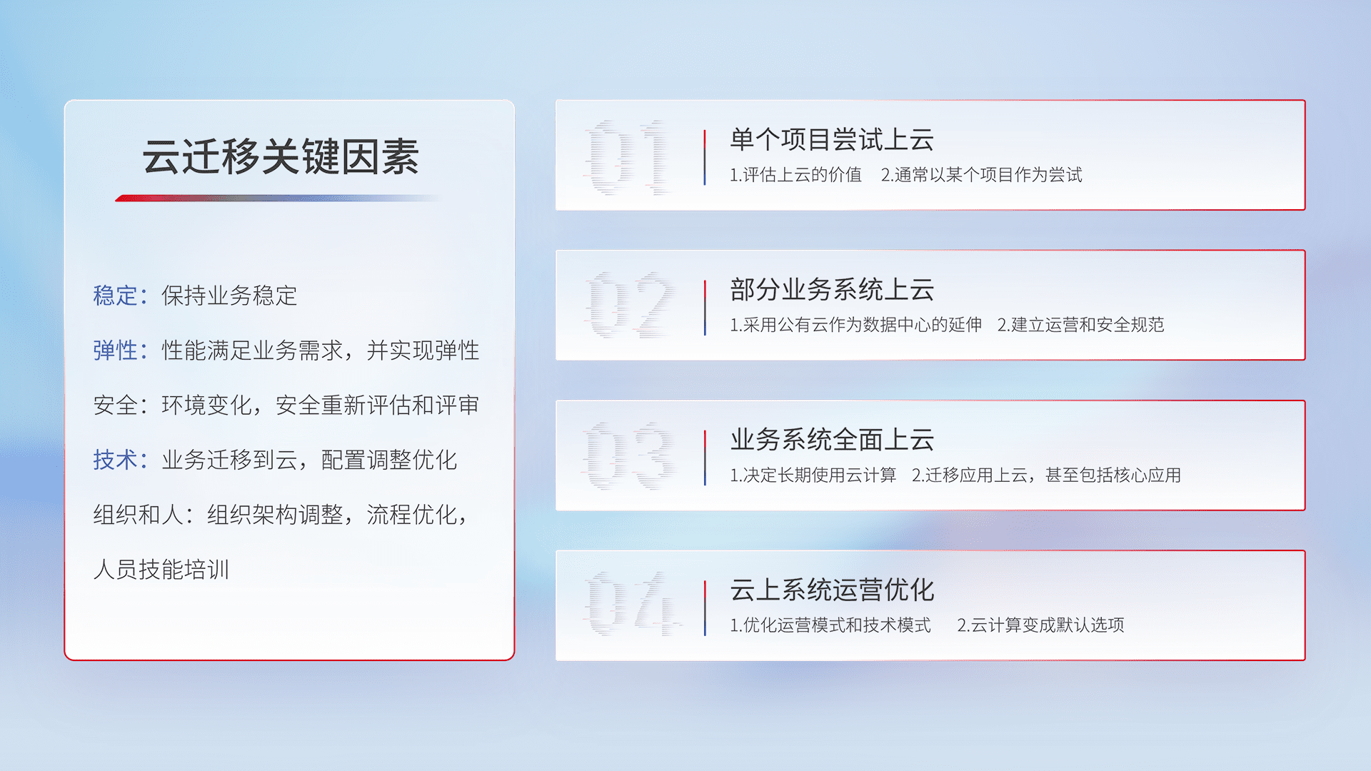 结合实际业务,,,,从规划设计、、云平台选型、、、云原生改造、、、数据迁移、、集成交付,,,迁移全过程为客户识别最佳上云路径,,做好风险识别管理,,设计网络架构、、、身份权限、、安全审计合规、、、、操作审计、、、、日志审计、、监控告警策略、、、多站点容灾设计等,,,,对云上基础设施进行整体规划,,提升IT治理水平,,以满足弹性、、、、高可用、、高性能的需求。。。