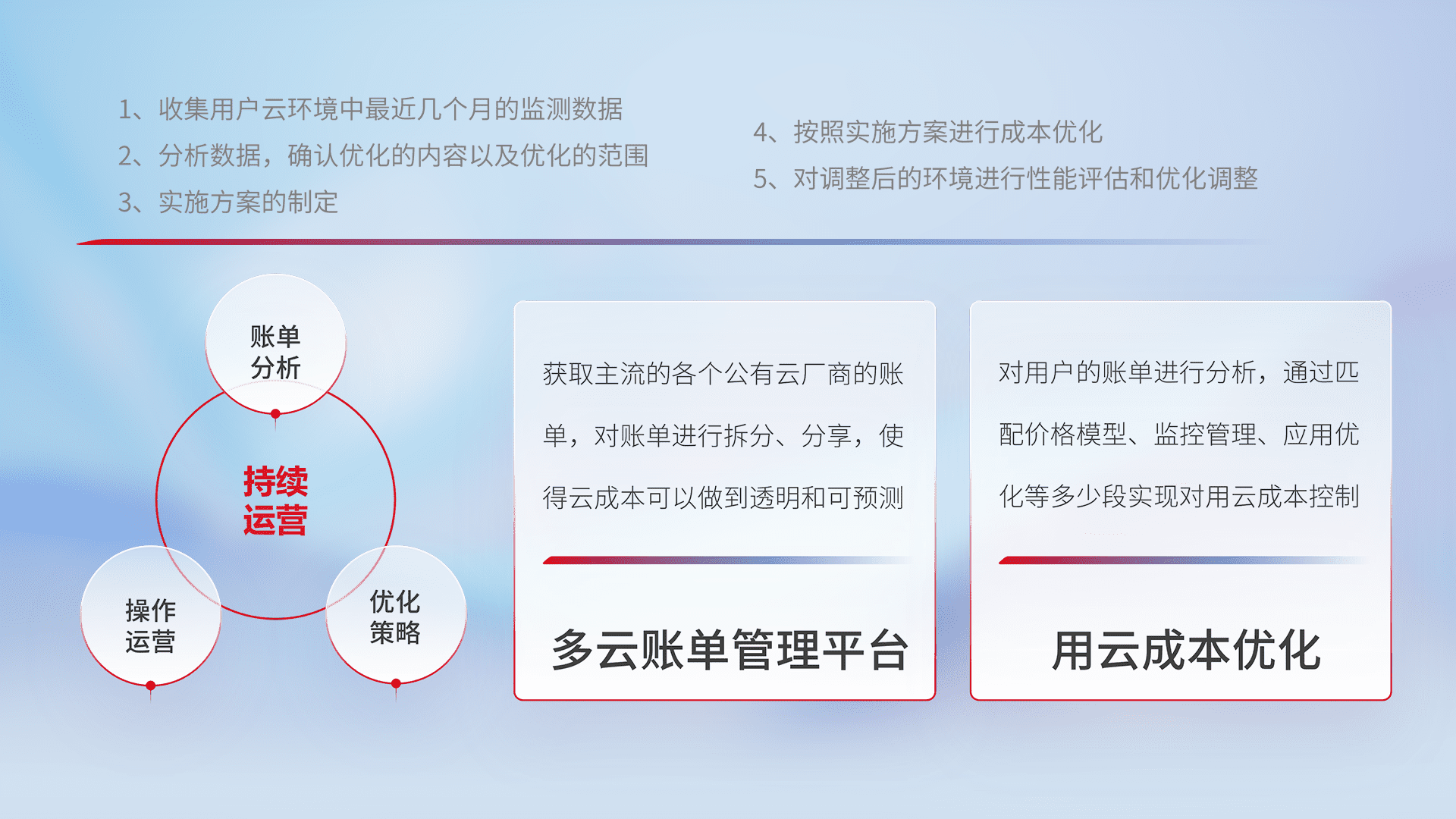 通过多云纳管,,,以统一的资源数据模型把客户的云资源进行抽象和封装,,,,进而实现对多云资源的统一操作,,,保障云资源管理的可靠性、、、、稳定性与可用性。。。。量身定制化运维内容,,,,配置、、开发运维、、、补丁管理、、、、备份、、监控、、、、认证和访问管理、、、审计和日常巡检等,,,保障在用云过程中的可靠度,,稳定度以及高可用率。。。